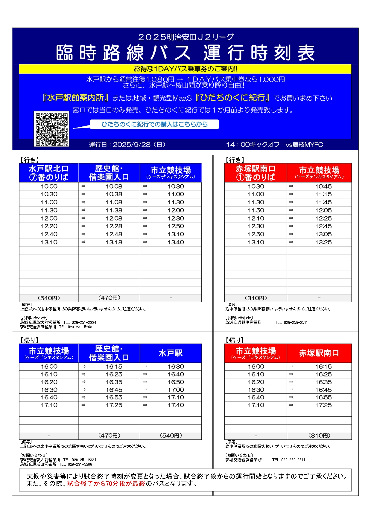 ホームゲーム開催日:水戸駅北口7番乗り場、赤塚駅南口1番乗り場より茨城交通バスの路線バス増発がございます。
