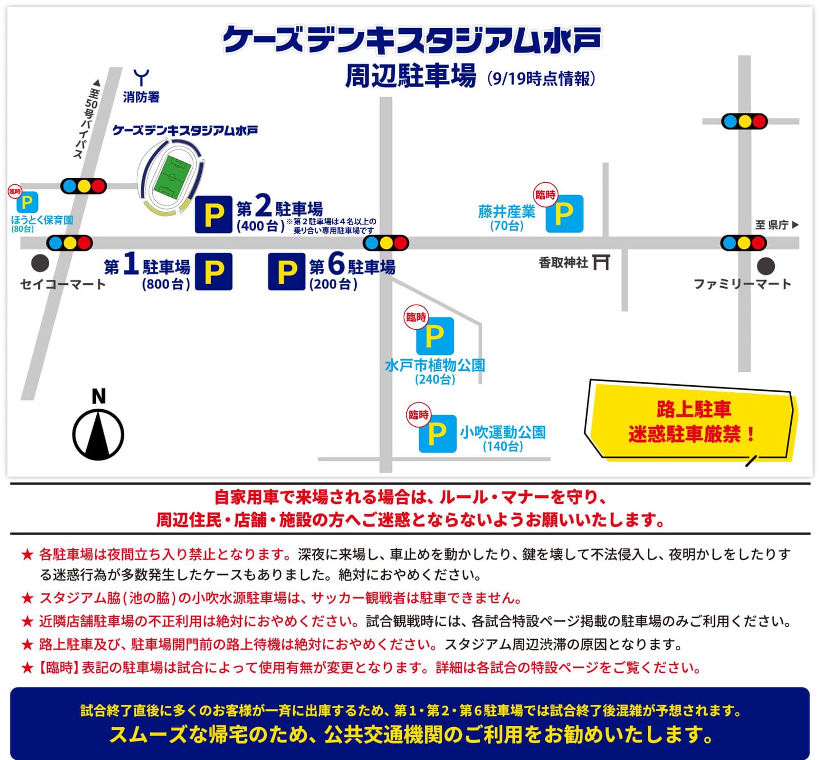 試合終了直後に多くのお客様が一斉に出庫するため、ケーズデンキスタジアム水戸の併設駐車場(第1駐車場・第2駐車場)では、試合終了後1時間ほどの混雑が予想されます。スムーズな帰宅には、公共交通機関・各臨時駐車場の利用をお勧めいたします