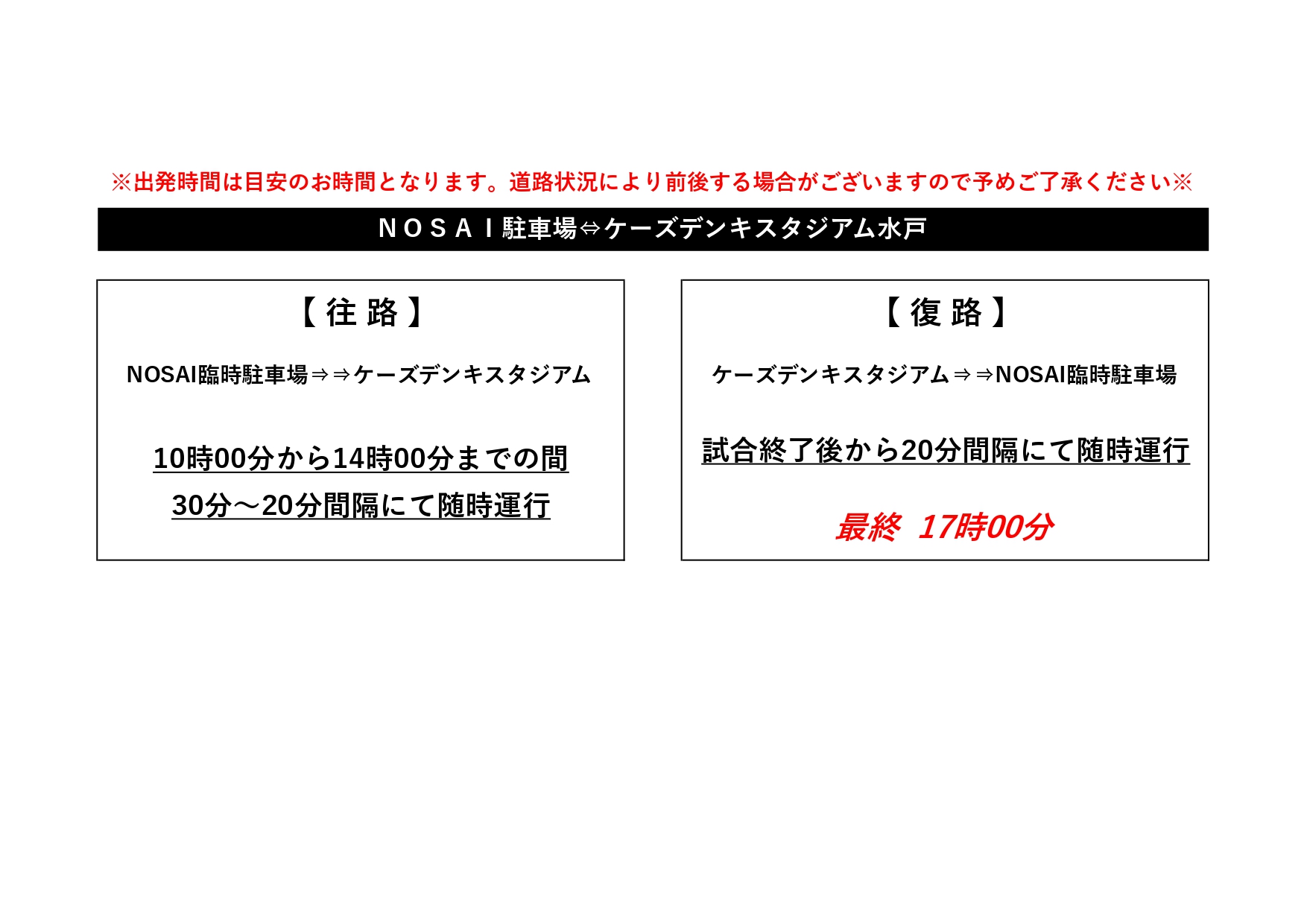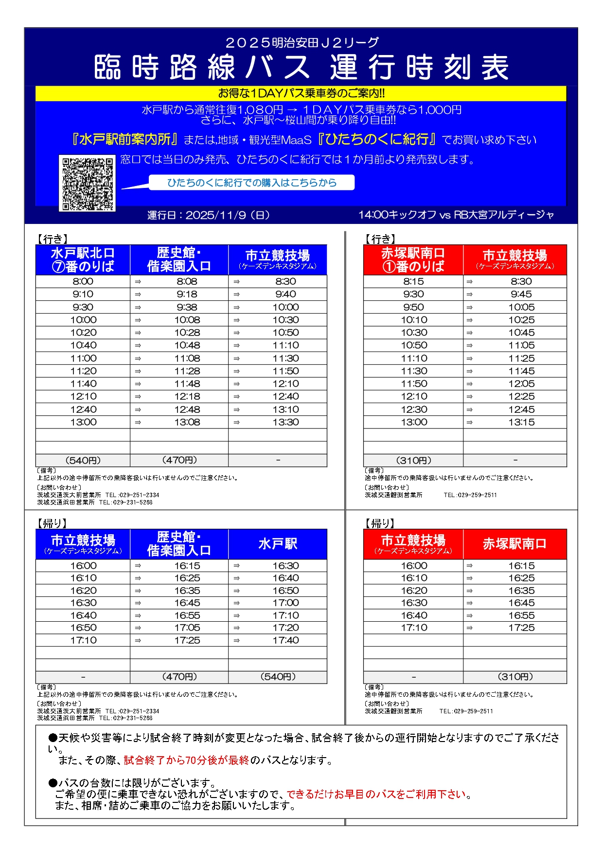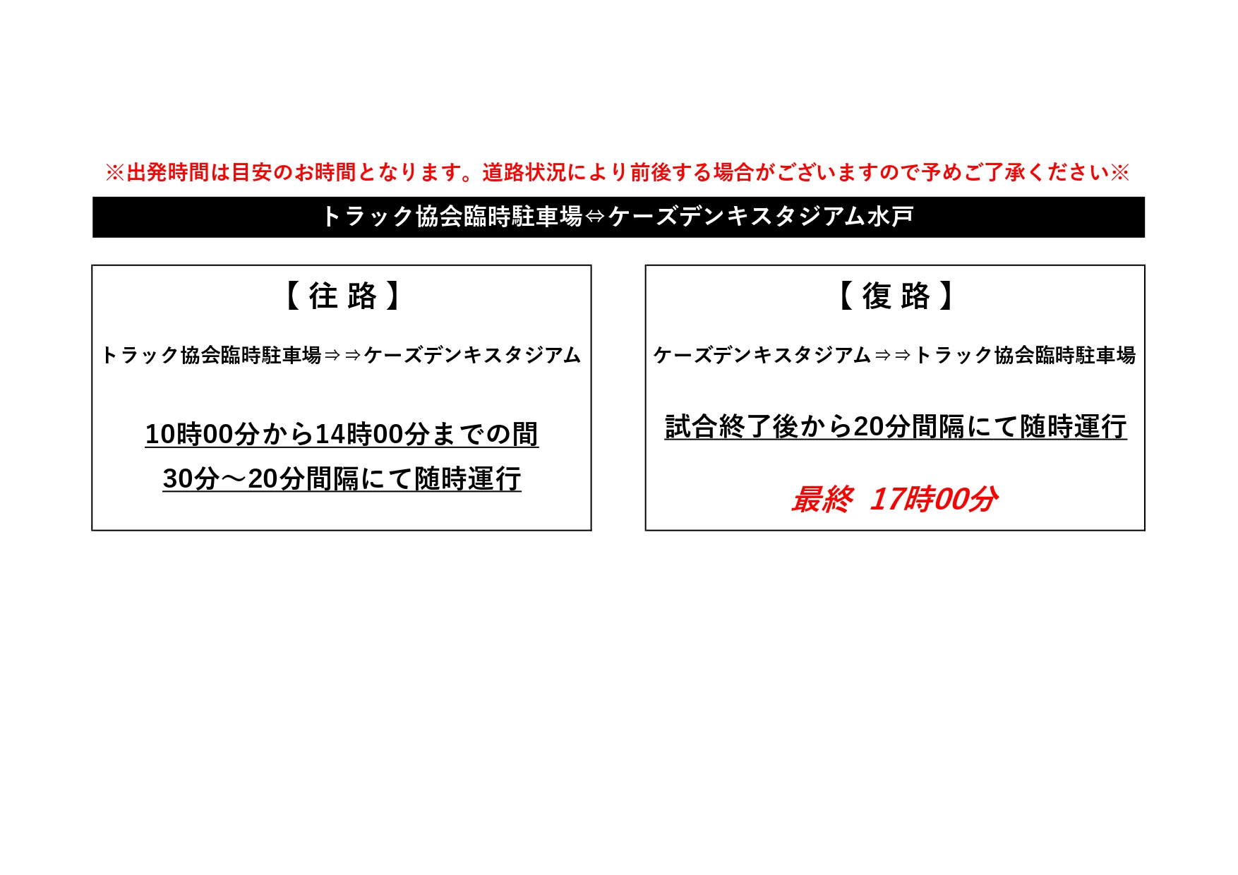 ホームゲーム開催日:水戸駅北口7番乗り場、赤塚駅南口1番乗り場より茨城交通バスの路線バス増発がございます。