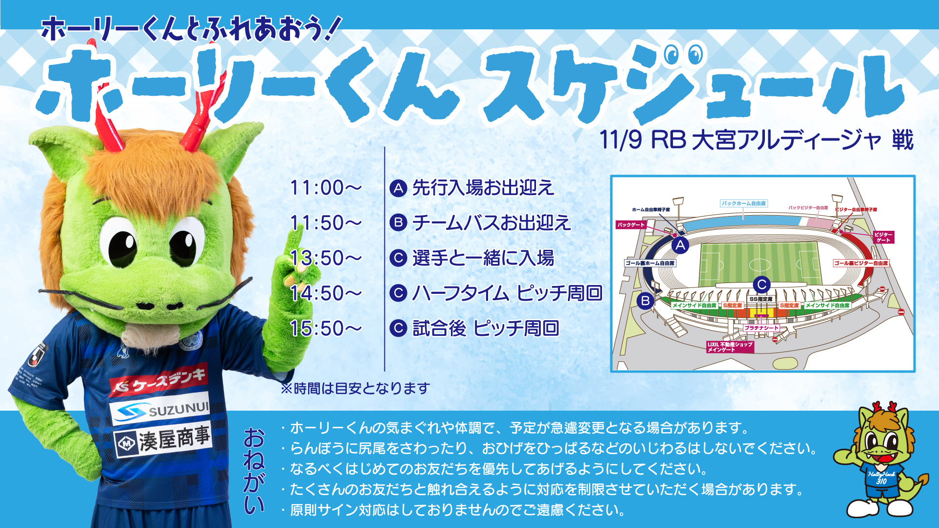 「15市町村ホームタウンPR大使」「ホームタウンホーリーくん」といった、クラブが街に根付き、街が盛り上がる、街を盛り上げる活動にも注力し、地方クラブであるからこそ地域課題や企業課題にも向き合い、トップチーム・アカデミー・フロントが一体となって地域に還元して参ります。