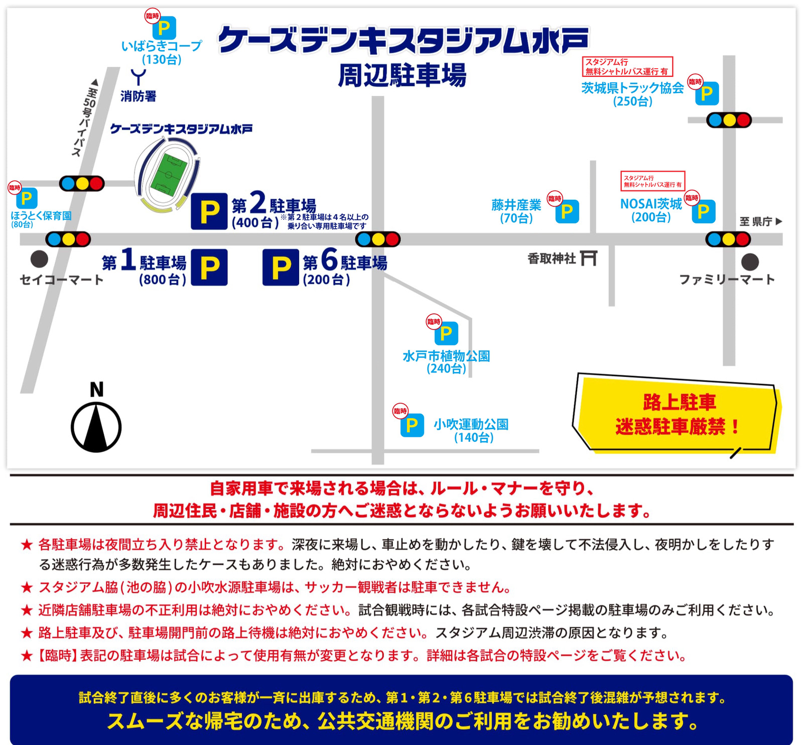 試合終了直後に多くのお客様が一斉に出庫するため、ケーズデンキスタジアム水戸の併設駐車場(第1駐車場・第2駐車場)では、試合終了後1時間ほどの混雑が予想されます。スムーズな帰宅には、公共交通機関・各臨時駐車場の利用をお勧めいたします