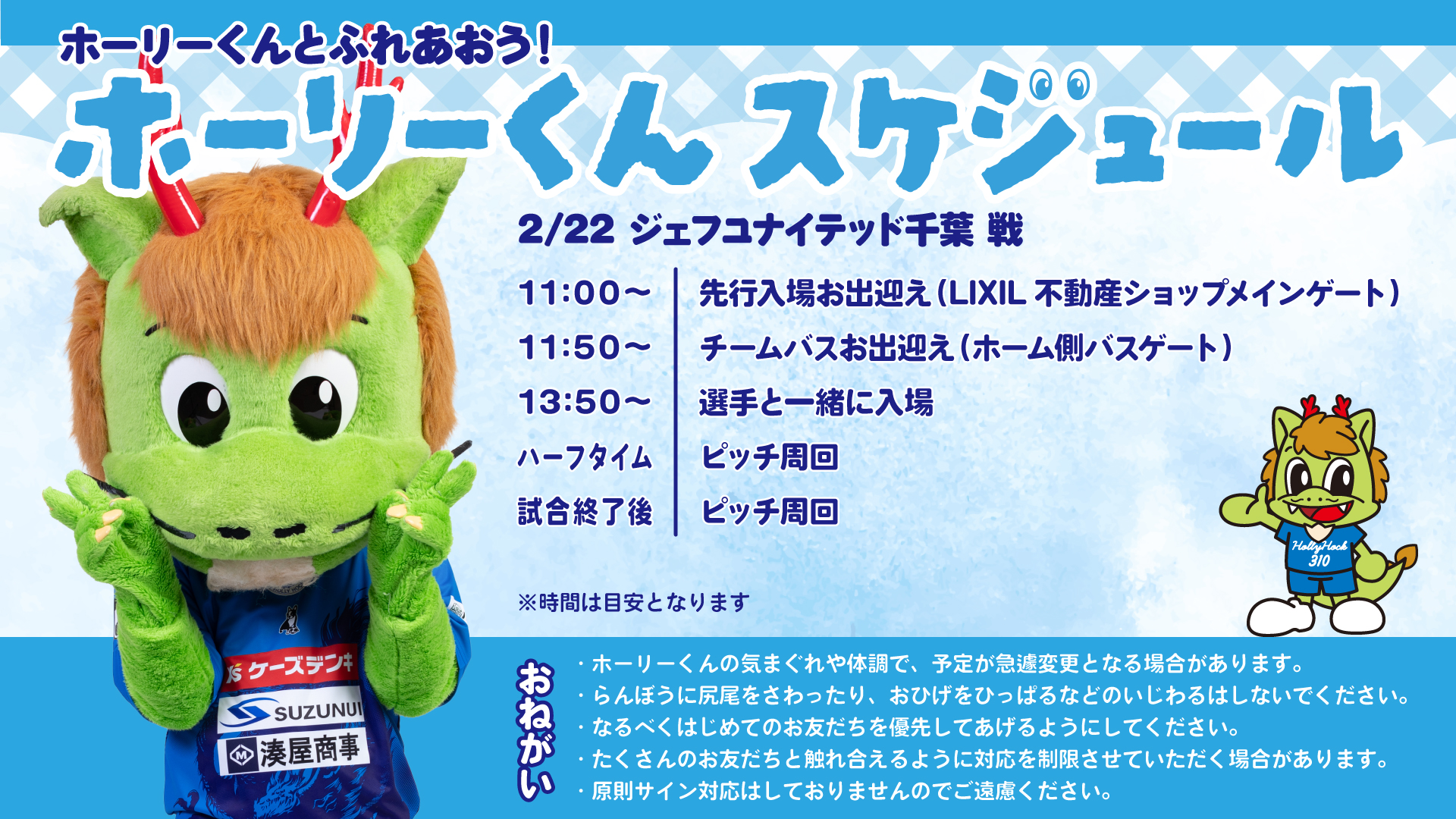 「15市町村ホームタウンPR大使」「ホームタウンホーリーくん」といった、クラブが街に根付き、街が盛り上がる、街を盛り上げる活動にも注力し、地方クラブであるからこそ地域課題や企業課題にも向き合い、トップチーム・アカデミー・フロントが一体となって地域に還元して参ります。