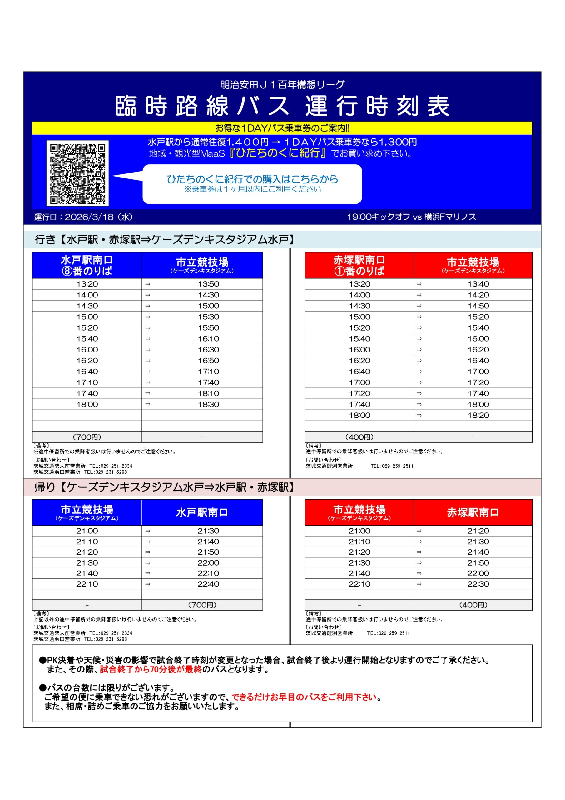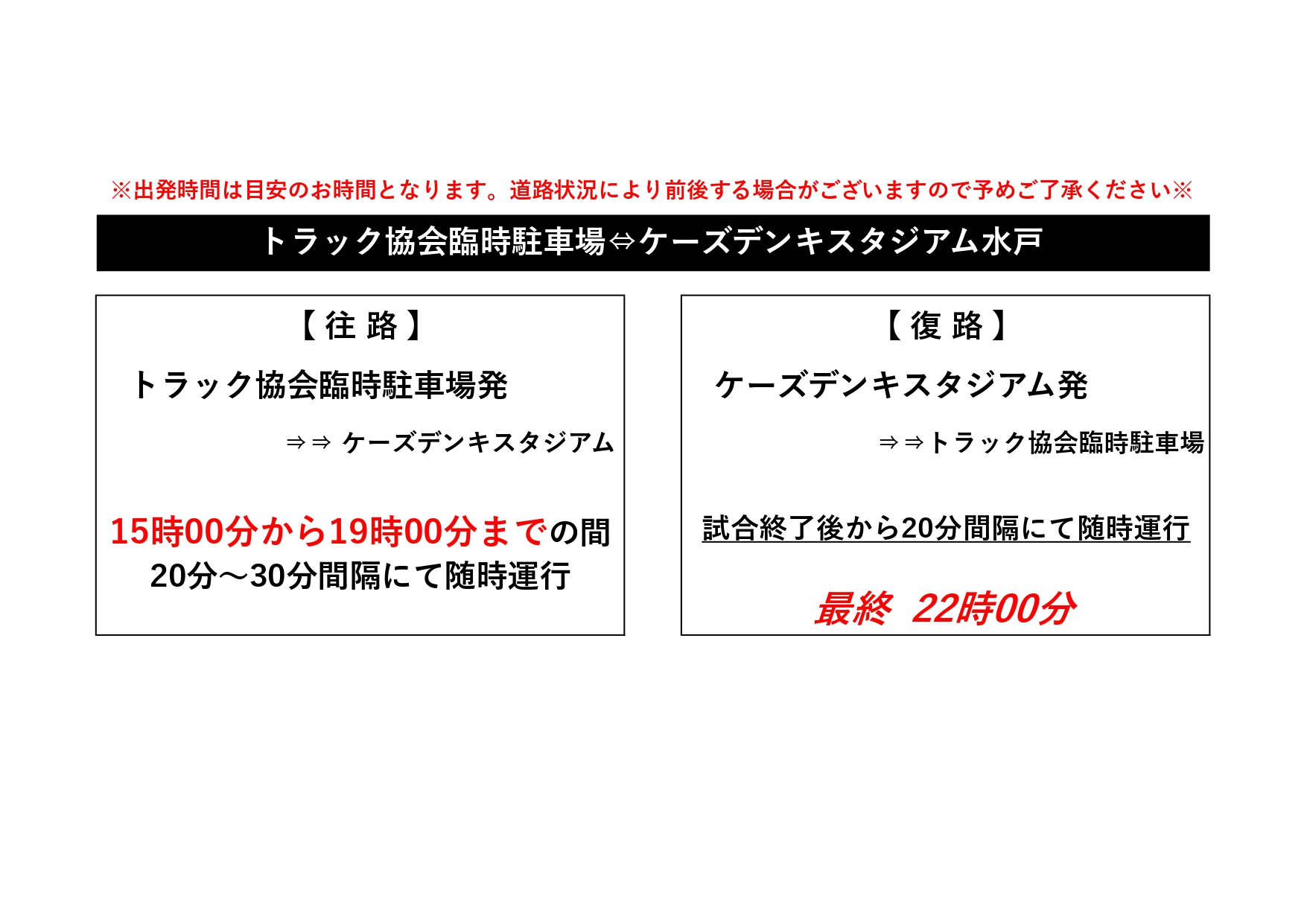 ホームゲーム開催日:水戸駅南口8番乗り場、赤塚駅南口1番乗り場より茨城交通バスの路線バス増発がございます。