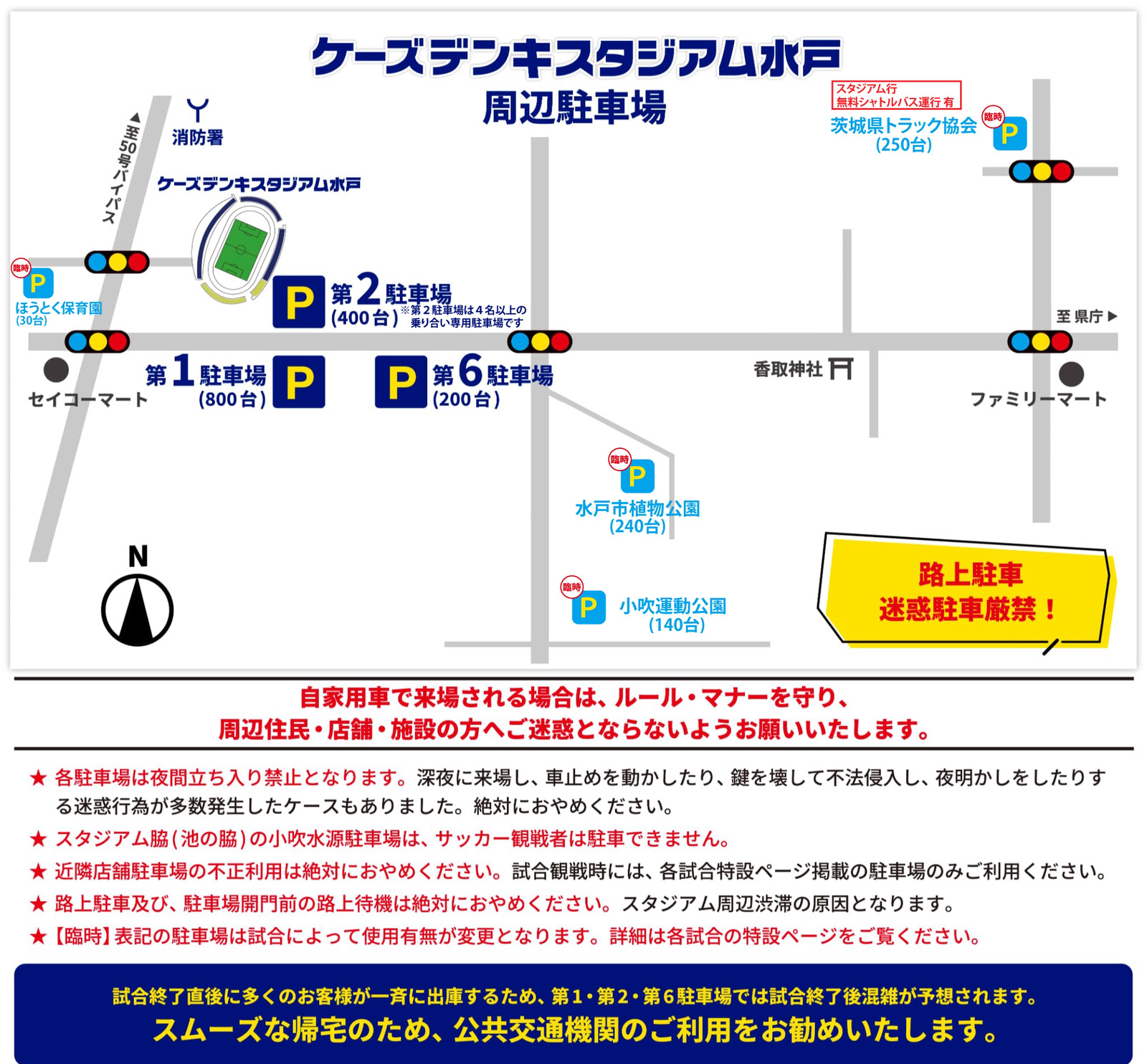 試合終了直後に多くのお客様が一斉に出庫するため、ケーズデンキスタジアム水戸の併設駐車場(第1駐車場・第2駐車場)では、試合終了後1時間ほどの混雑が予想されます。スムーズな帰宅には、公共交通機関・各臨時駐車場の利用をお勧めいたします