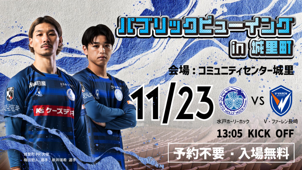 水戸ホーリーホックでは、ホームタウンである城里町のご協力のもと、10月23日(日)に開催されるアウェイゲーム(2025明治安田J2リーグ 第37節 V・ファーレン長崎 vs. 水戸ホーリーホック)において、パブリックビューイング(ライブ中継)を開催いたします。