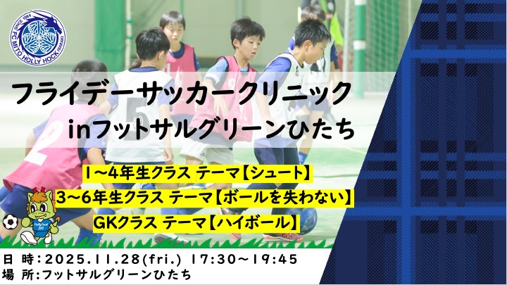 【11/28(金)開催】「水戸ホーリーホックフライデーサッカークリニックinフットサルグリーンひたち」 開催のお知らせ