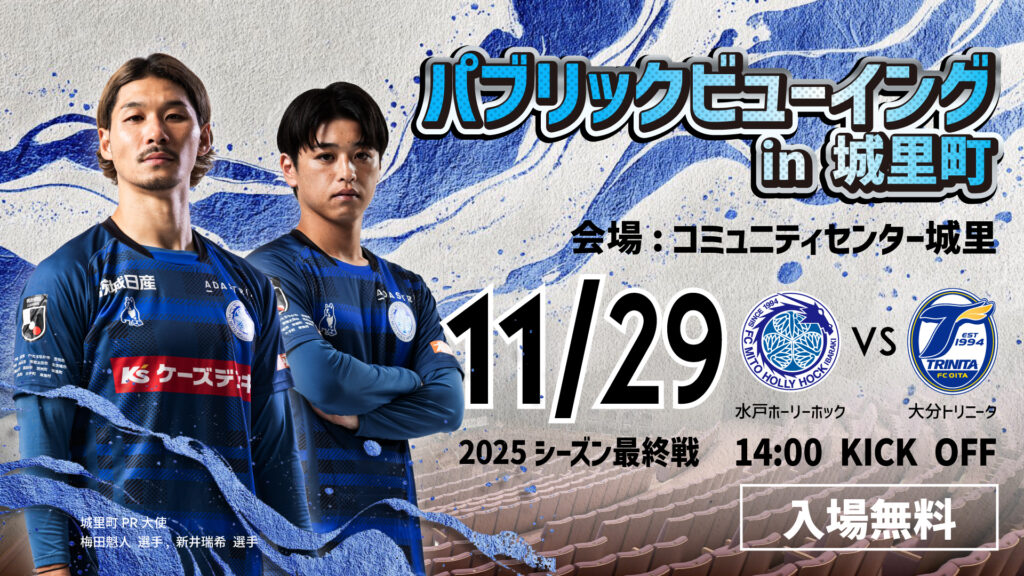 水戸ホーリーホックでは、ホームタウンである城里町のご協力のもと、11月29日(土)に開催されるホームゲーム(2025明治安田J2リーグ 第38節 水戸ホーリーホック vs. 大分トリニータ)において、パブリックビューイング(ライブ中継)を開催いたします。