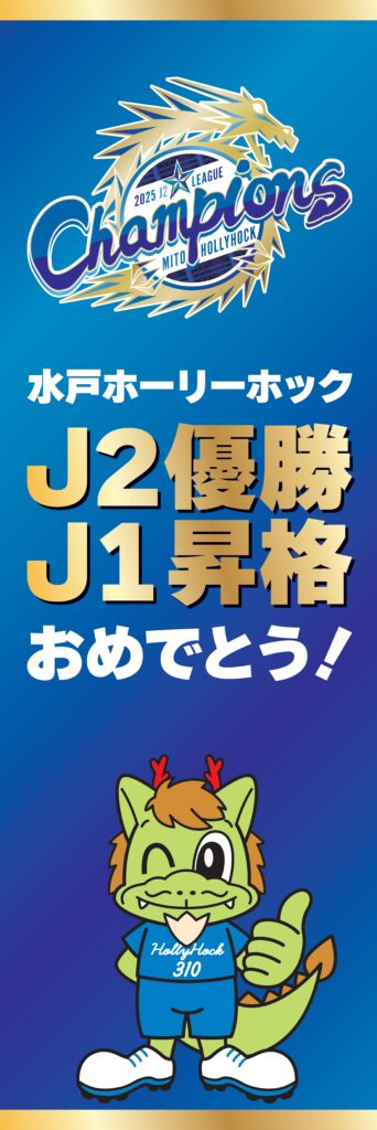 このたび水戸ホーリーホックの「J2優勝」「J1昇格」を記念した記念バージョンの「応援のぼり」が完成しましたのでご案内させていただきます。