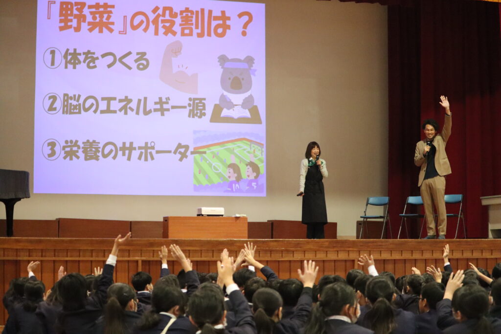 12月19日(金)、エメラルドパートナーのウルノ商事株式会社との共同企画として、地域の子どもたちに向けた食育活動を実施いたしました。当日は、水戸市立梅が丘小学校の6年生を対象に野菜ソムリエからの食育に関する授業を行い、ゲストとして水戸ホーリーホックからクラブリレーションオーガナイザー本間幸司、ユースコーチ飯田優二、ジュニアユースコーチ木村祐志の3名が登場いたしました。 授業の中では水戸ホーリーホックで活躍した選手たちの経験から、食事と体づくりについて子どもたちに向けたメッセージを送りました。