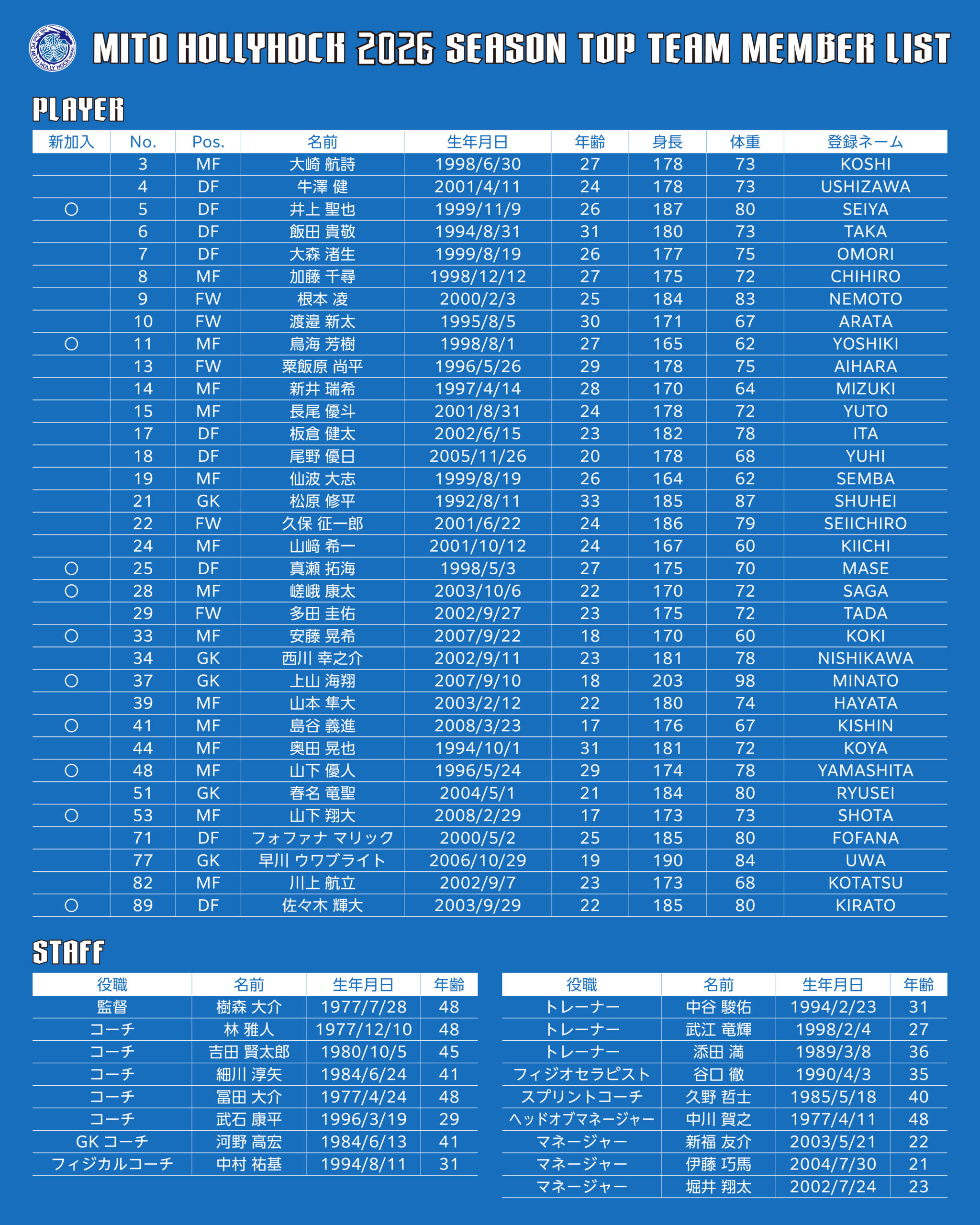 2026シーズントップチーム体制および選手背番号決定のお知らせ
