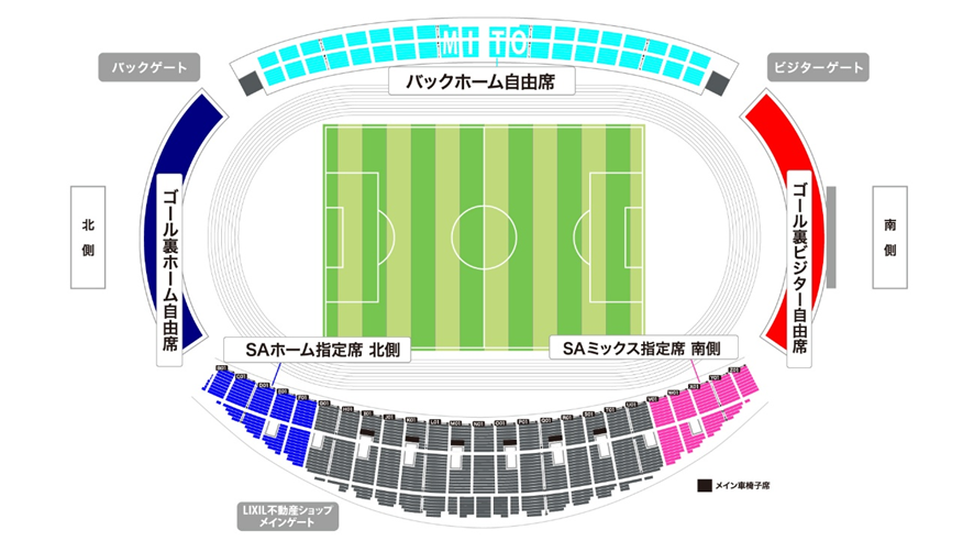 ※ビジターグッズを着用できるエリアは、SAミックス指定席 南側、ゴール裏ビジター自由席です。
