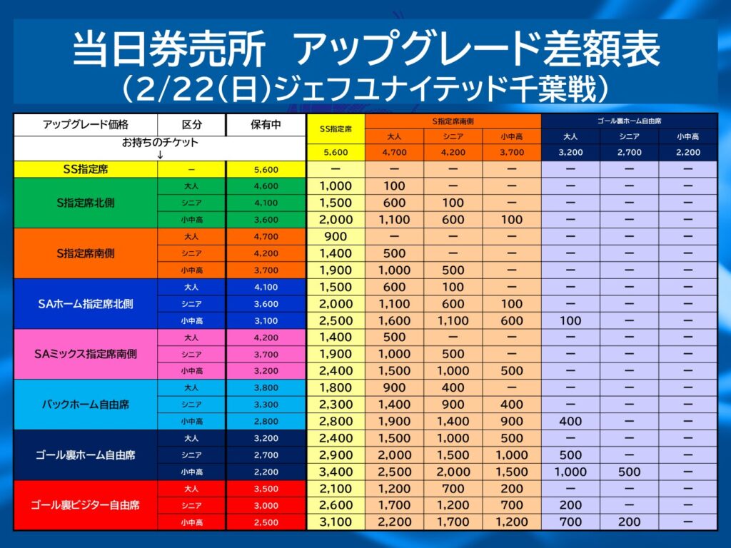 ・チケットのアップグレードはご希望の席種(一般当日価格)との差額をお支払いいただくことで上位カテゴリの席種へ変更が可能です。