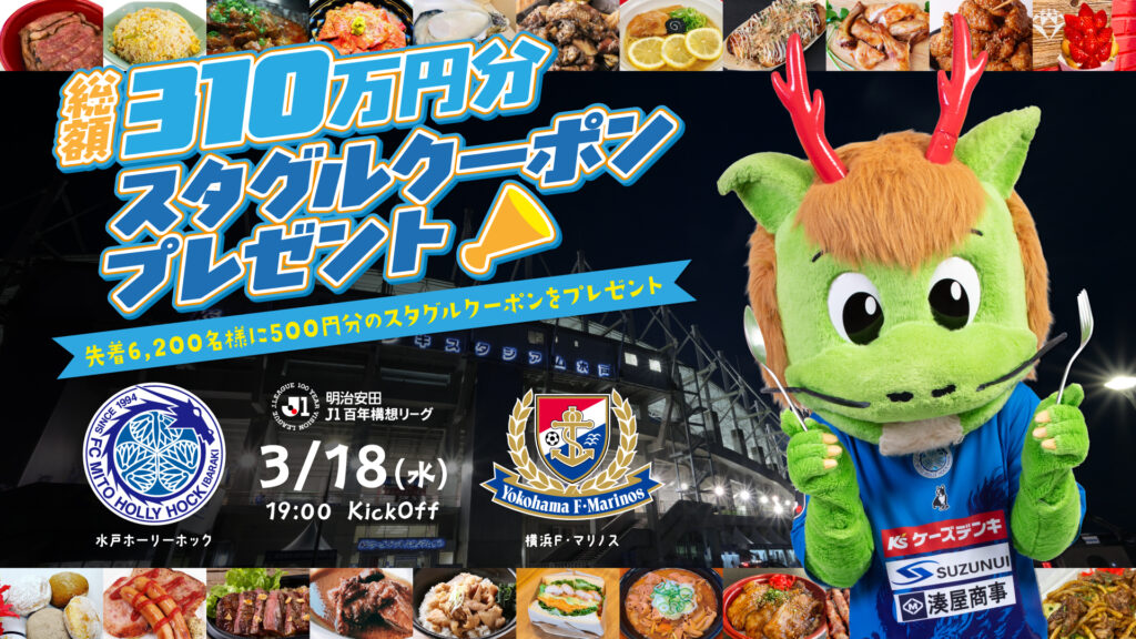 このたび3月18日(水)に開催するホームゲーム(明治安田J1百年構想リーグ 第7節 水戸ホーリーホック vs 横浜F・マリノス)において、スタジアムグルメでご利用いただける、「500円スタグルクーポン」を先着6,200名様にプレゼントいたします。