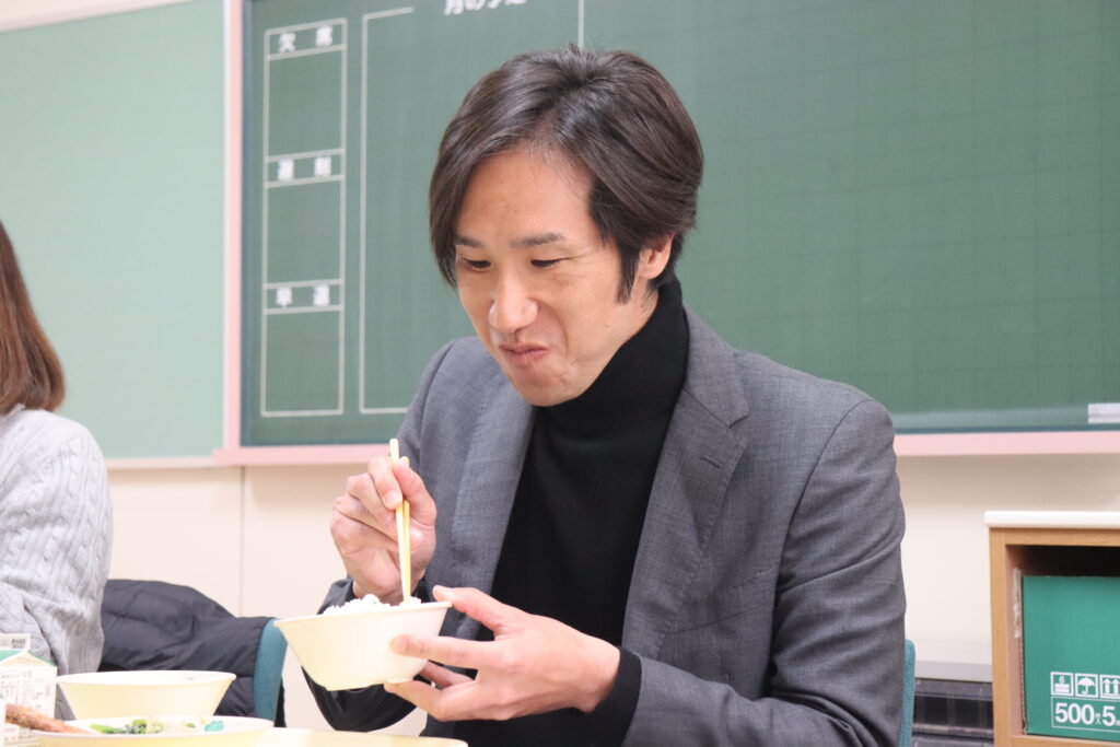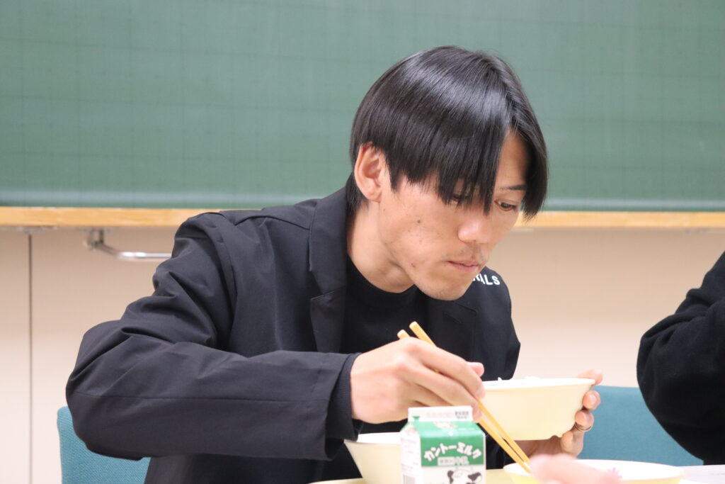 また、授業後には、学生たちと同じ給食をいただき、栄養士の先生がどのように考えて給食を作っているのか、理解を深めました。