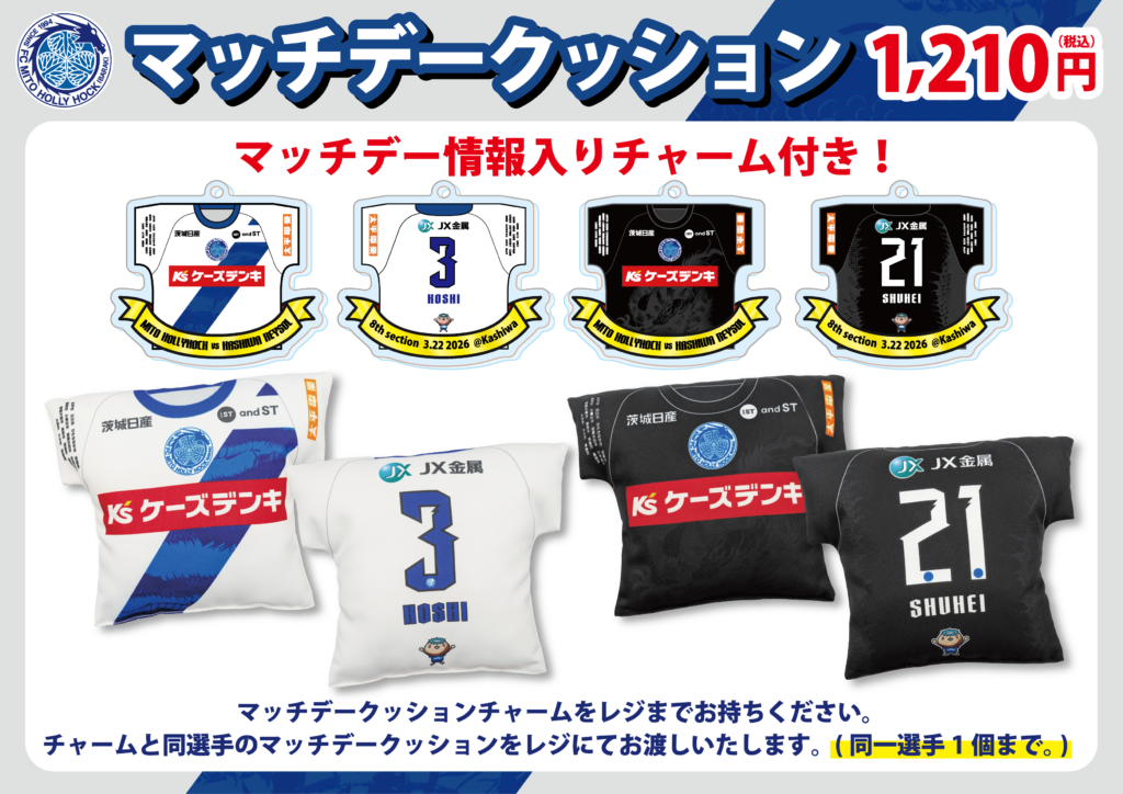 3月22日(日)三協フロンテア柏スタジアムで開催される明治安田J1百年構想リーグ第8節柏レイソル戦にて水戸ホーリーホックオフィシャルグッズの出張販売を行うことが決定いたしましたので、下記のとおりお知らせいたします。「マッチデーボンフィン」「マッチデーワイヤーリングキーホルダー」「マッチデークッション」をはじめ、「【ブラインド】ラバーコースターキーホルダー(2nd)」、タオルマフラー各種含め販売いたします。グッズ売店へのご来店お待ちしております!