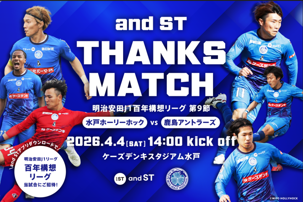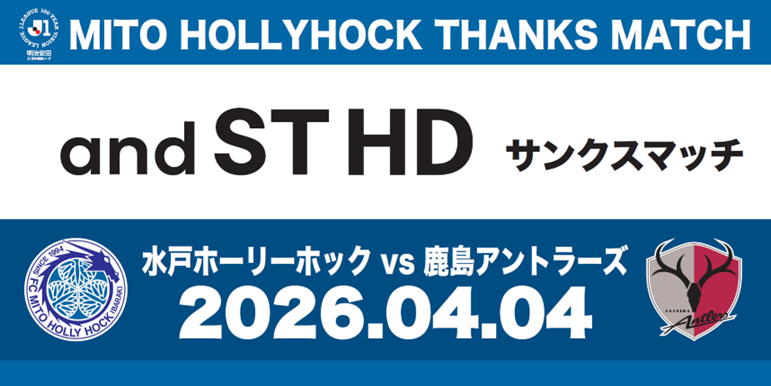 このたび、株式会社フットボールクラブ水戸ホーリーホック(代表取締役社長 小島耕、以下 水戸ホーリーホック)は、4月4日(土)に開催するホームゲーム、明治安田J1百年構想リーグ第9節 水戸ホーリーホック vs. 鹿島アントラーズを株式会社アンドエスティHDにご支援いただき「and STサンクスマッチ」として開催いたします。