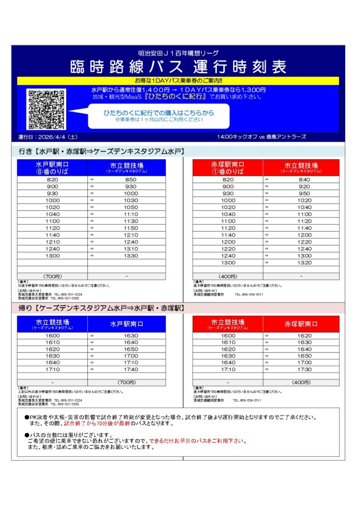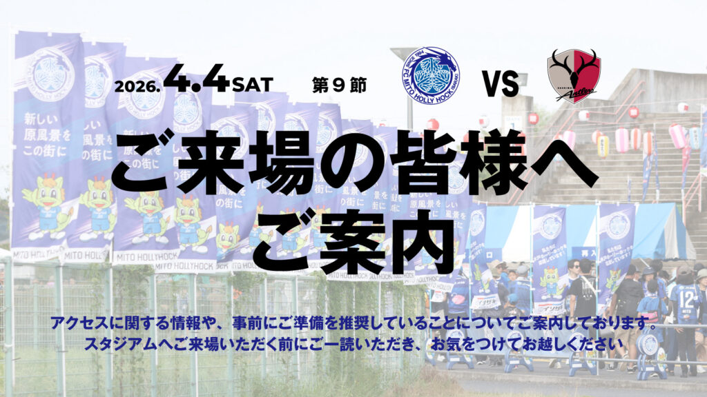 4月4日(土)に開催するホームゲーム(明治安田J1百年構想リーグ 第9節 水戸ホーリーホック vs. 鹿島アントラーズ)へご来場予定の皆さまへご案内いたします。