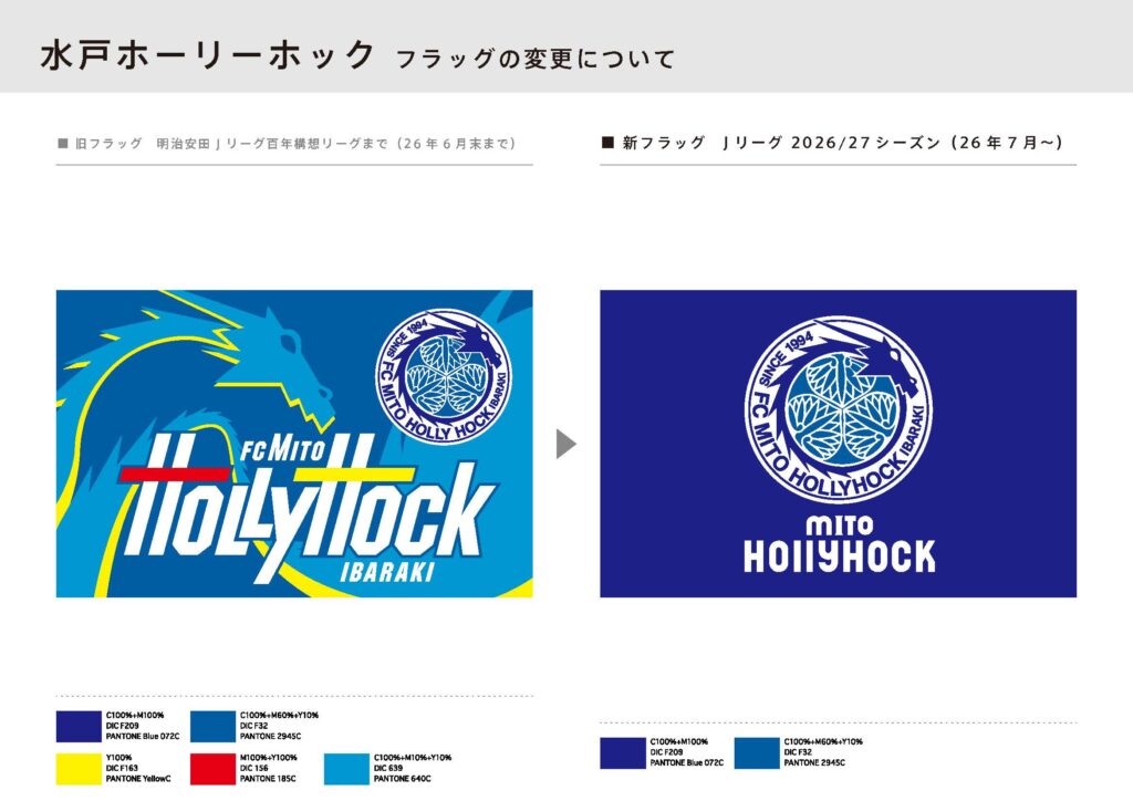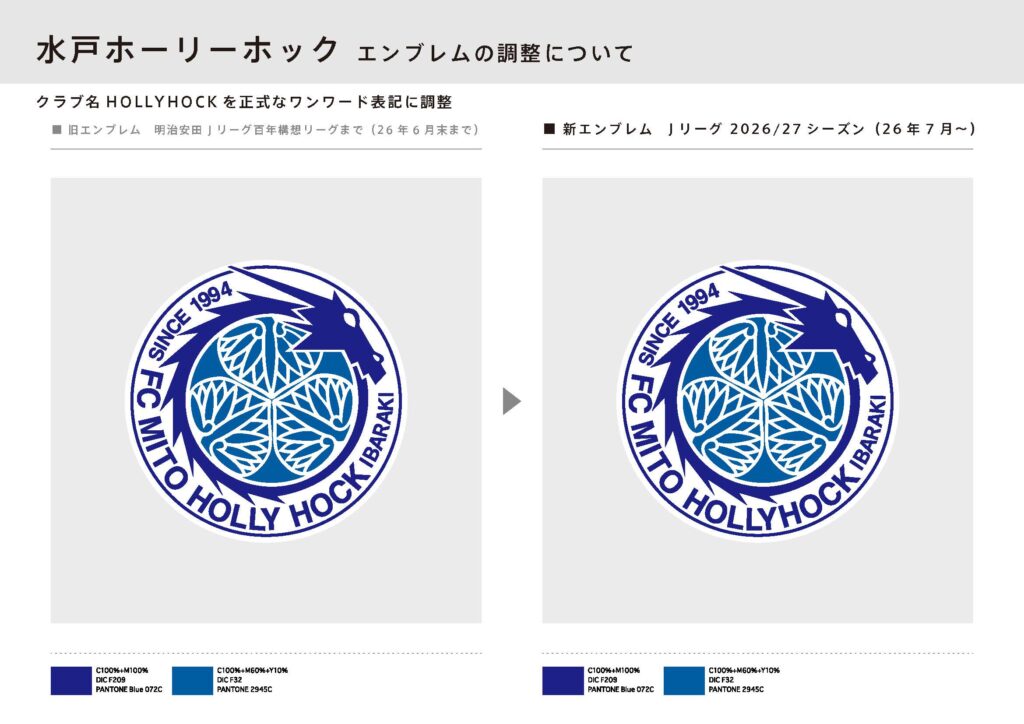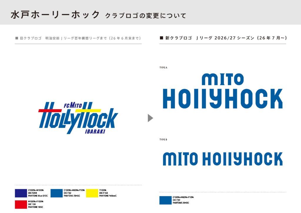 水戸ホーリーホックがこれまで育んできた「水戸らしさ」は、クラブを愛する皆様の寄りどころとなる変わらないエンブレム(歴史と誇り)と、時代に合わせて進化し続けるロゴ(挑戦と変化)が並び立つことで形づくられていくものと考えています。