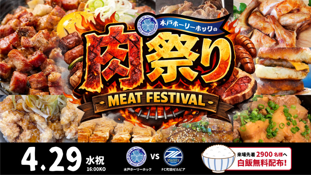 4月29日(水祝)に開催するホームゲーム(明治安田J1百年構想リーグ 第13節 水戸ホーリーホック vs FC町田ゼルビア)にて、スタジアムグルメイベント「水戸ホーリーホックの肉祭り」を開催します!