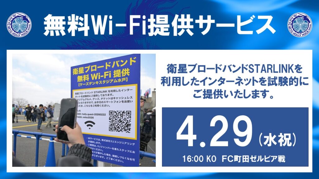 【4/29(水・祝)町田戦】衛星ブロードバンド無料Wi-Fi 試験的提供のお知らせ