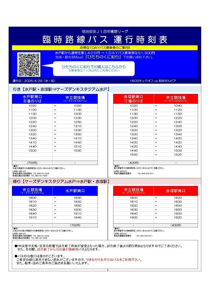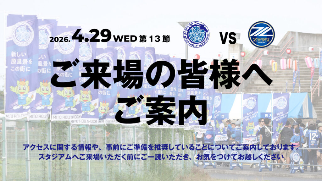 4月29日(水・祝)に開催するホームゲーム(明治安田J1百年構想リーグ 第13節 水戸ホーリーホック vs. FC町田ゼルビア)へご来場予定の皆さまへご案内いたします。