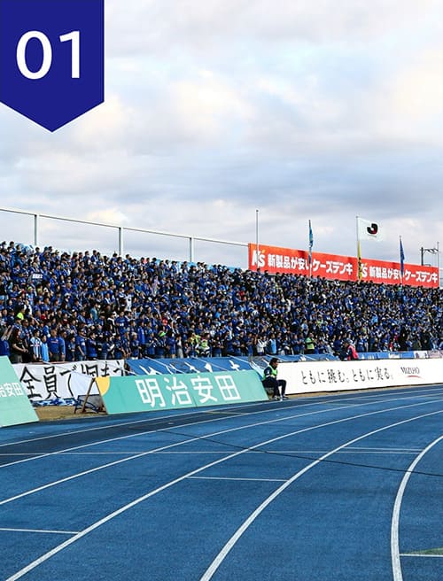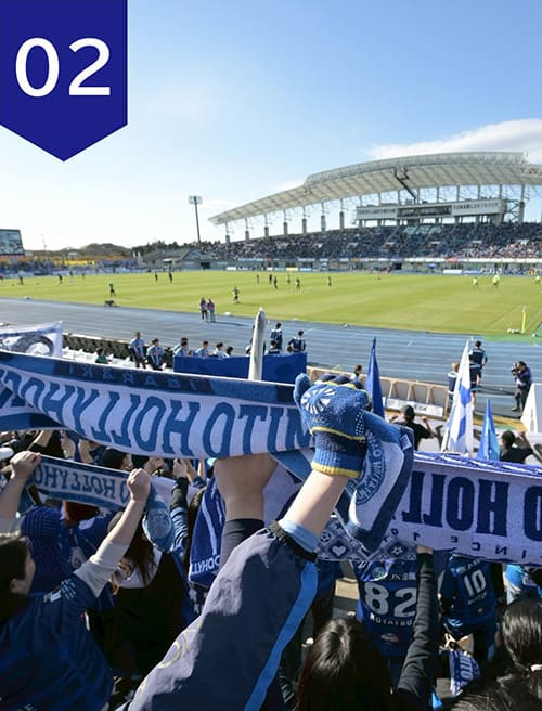 「前列」は選手入場やセレモニーに近く、「後列」はピッチを俯瞰して観たり、雨の日も濡れにくい!